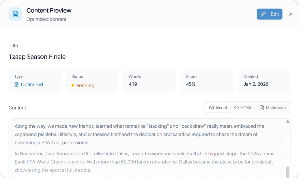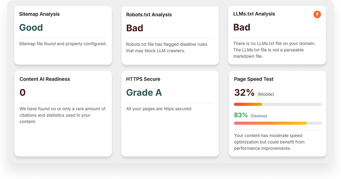 It also builds answer-ready content structures, schema, and internal links.