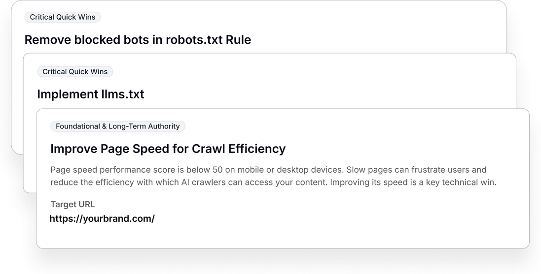 diagnose what’s blocking your brand from being cited, prioritise the highest-impact moves, help you execute, and prove the ROI—across countries and markets.